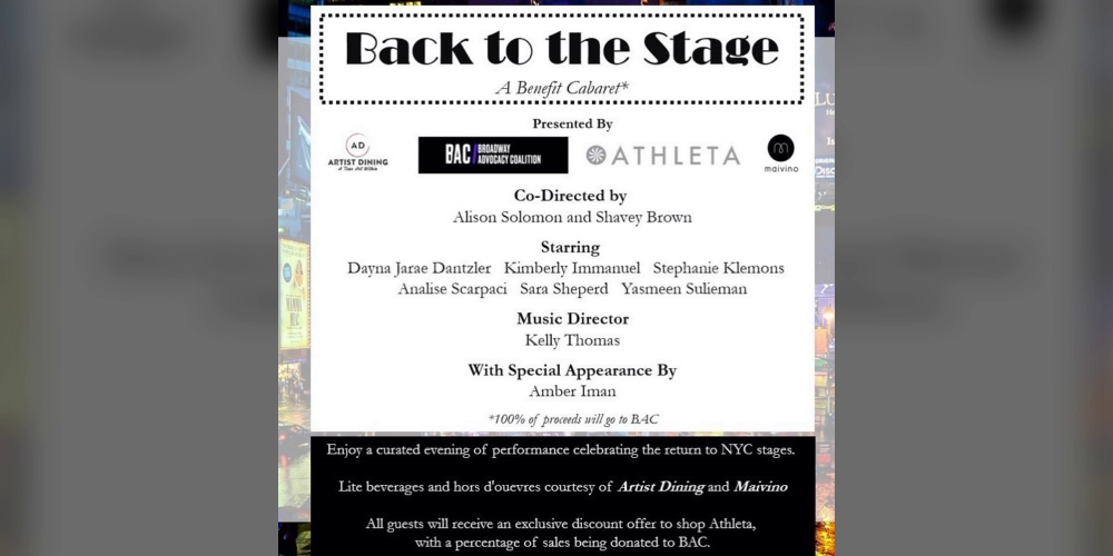 Back to the Stage is an exclusive concert benefiting the Broadway Advocacy Coalition and Sponsored by Athleta NYC. Co-Creative Directors Alison Solomon (Charlie and the Chocolate Factory, Beautiful the Carole King Musical) and Shavey Brown (My Fair Lady, Smokey Joe’s Cafe) have curated an evening that celebrates the reopening of theater in NYC. Pre-show beverages and hors d’oeuvres are being provided by Maivino and Artist Dining. All proceeds from the event will be donated to the Broadway Advocacy Coalition.
